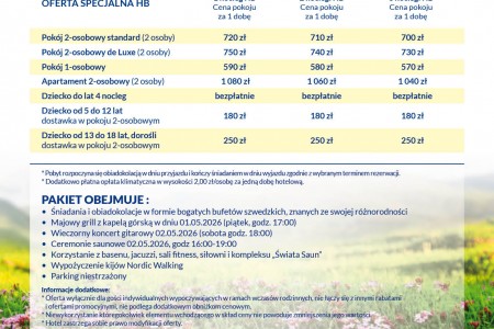 * Dodatkowo płatna opłata klimatyczna w wysokości 2,00 zł/osobę za jedną dobę hotelową.