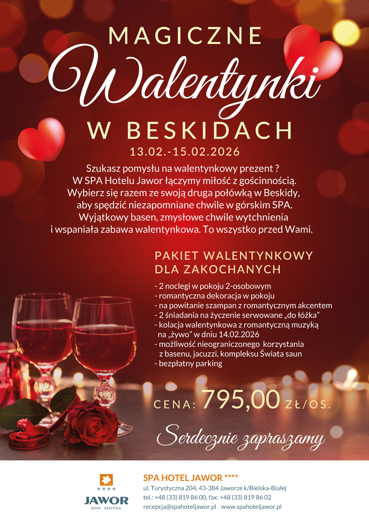 Szukasz pomysłu na walentynkowy prezent? W SPA Hotelu Jawor łączymy miłość z gościnnością. Wybierz się razem ze swoją druga połówką w Beskidy, aby spędzić niezapomniane chwile w górskim SPA. Wyjątkowy basen, zmysłowe chwile wytchnienia i wspaniała zabawa walentynkowa. To wszystko przed Wami.